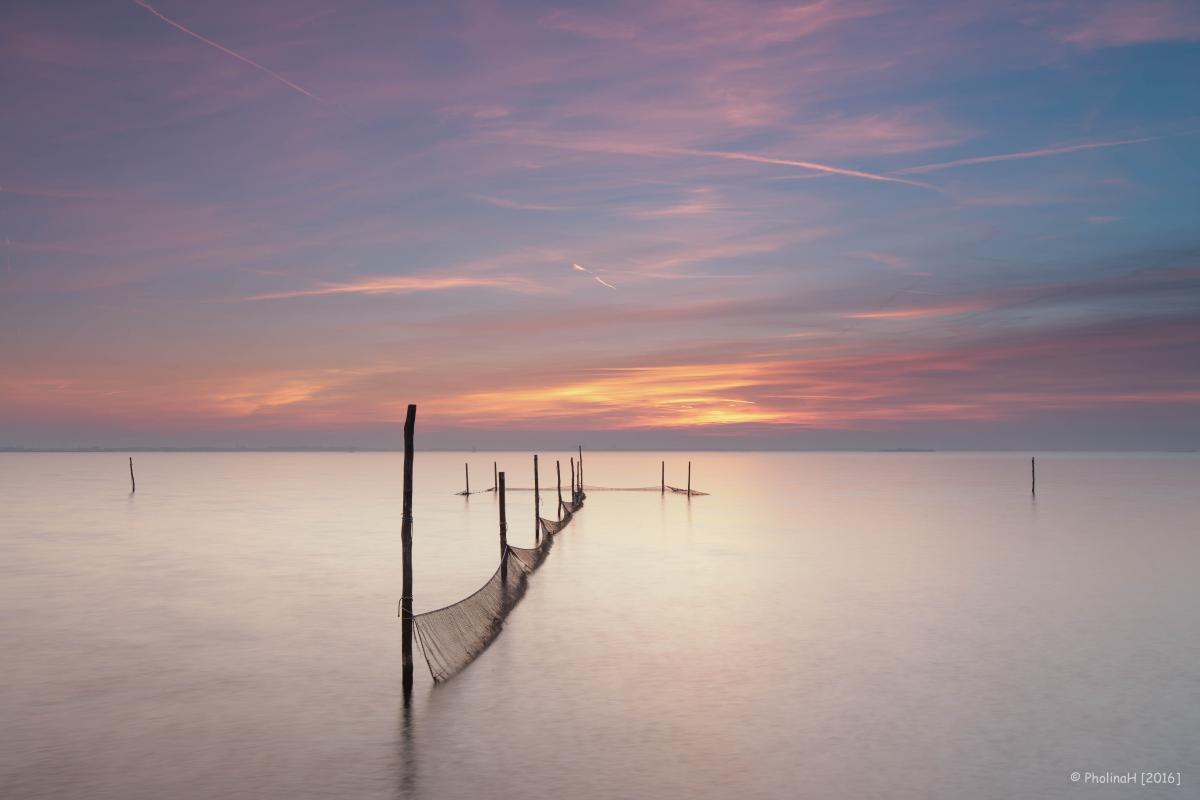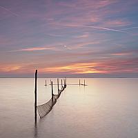 Deze opname is gemaakt vanaf de Oostvaardersdijk. Op veel plaatsen zie je daar deze decoratieve stokken met netten. Je kijkt naar het IJmeer met op de achtergrond het eilandje Pampus.