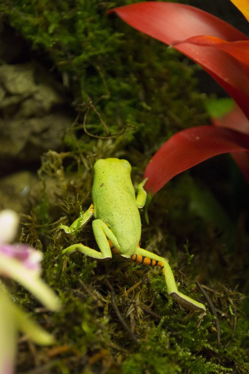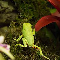 Dit is een van onze tijgerboomkikkers. Deze foto is gemaakt toen we ze net hadden en in het terrarium gingen zetten. Ik had deze kikker bij de waterval neergezet en hij ging langzaam het terrarium onderzoeken en een rustig plekje zoeken om te slapen.
