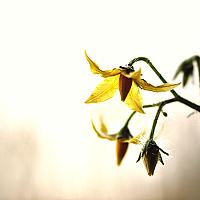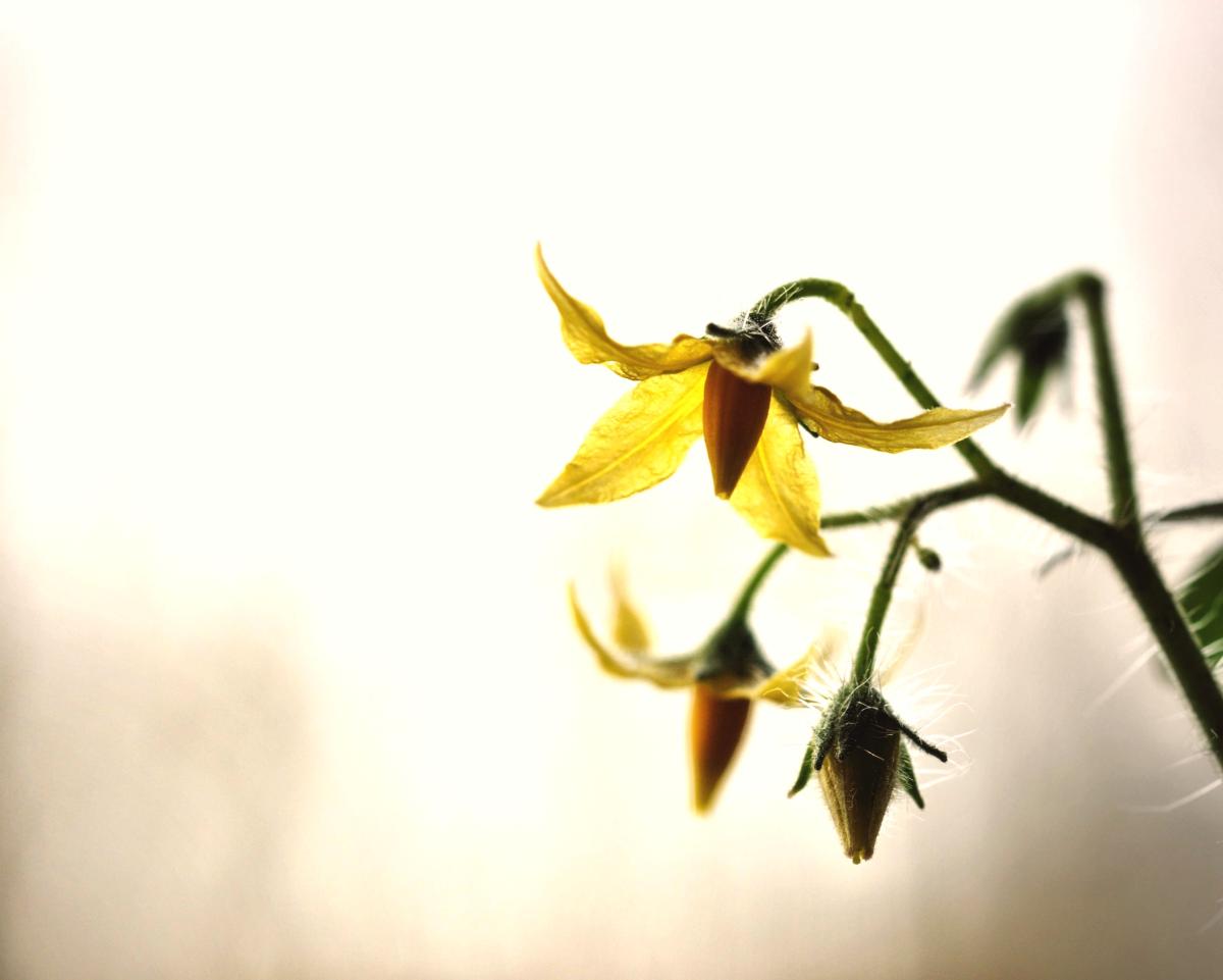 Hele kleine bloemetjes van de tomaten plant, lijken een stuk groter door een macro foto met rust in de achtergrond.
