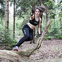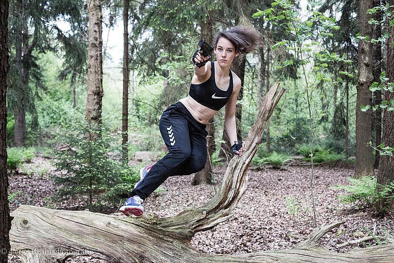 Actie foto van jong model (16) in de stijl van het actiespel Tomb Raider. Korrel via Lightroom toegevoegd om een filmisch effect te creëren.