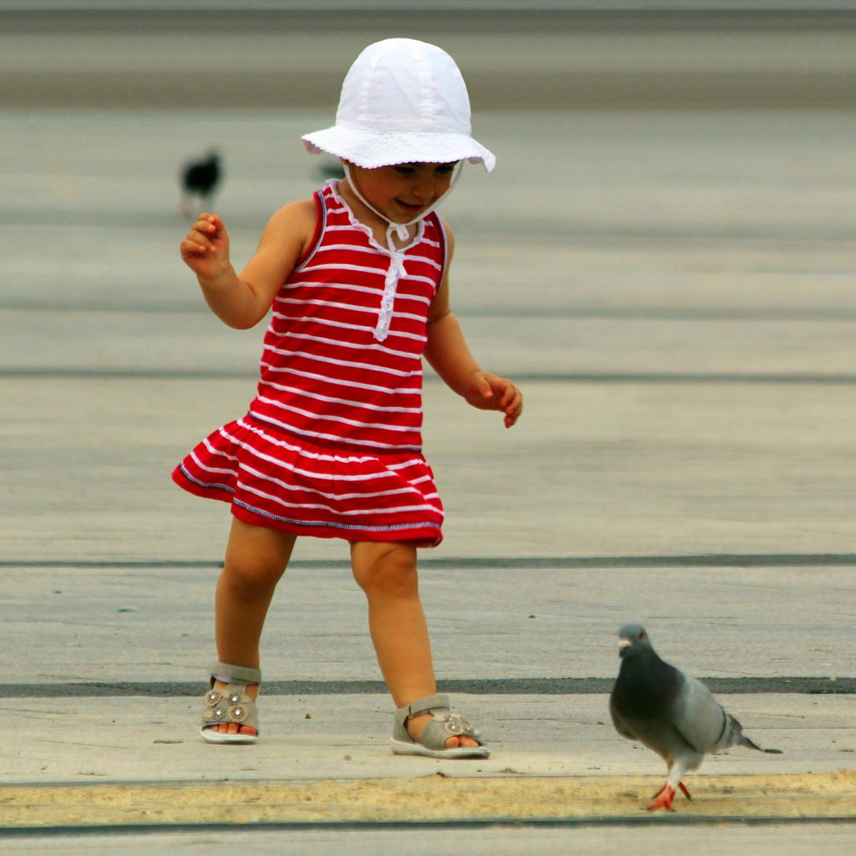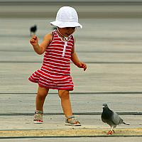 Kinderen zijn gefascineerd door de duiven die je in de stad tegen komt. Er achteraan rennen, opjagen of ze proberen te vangen,,, De duiven zijn ze altijd te snel af. Dit geld ook voor dit meisje. Wankel op haar beentjes rent ze achter de duiven aan maar tevergeefs,,, de duiven zijn te snel.