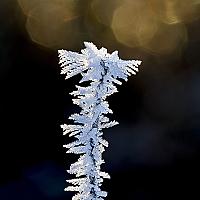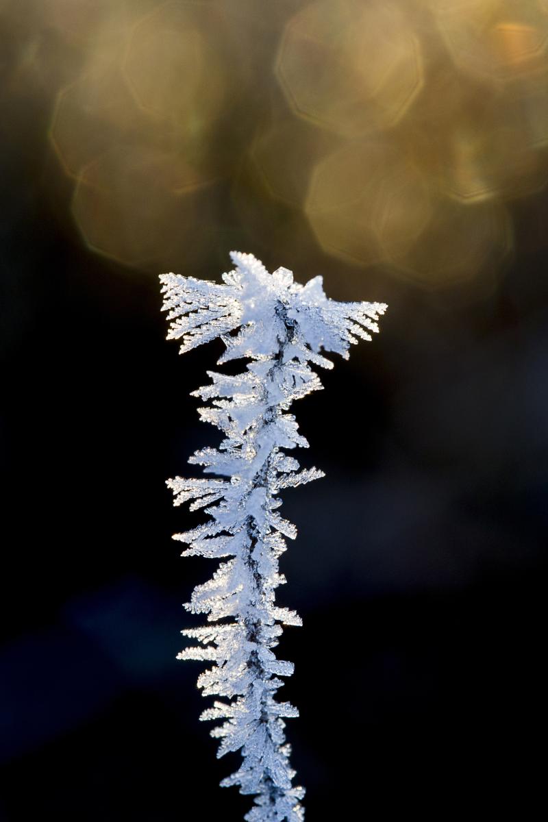 In een van de eerste winternachten was een takje heide prachtig bevroren. Het lijkt 's morgens vroeg te reiken naar de zon die opkomt en in een mooie bokeh is gevangen.