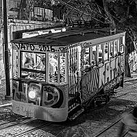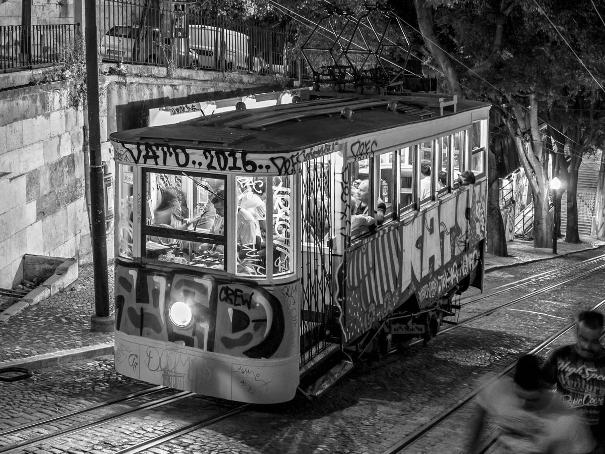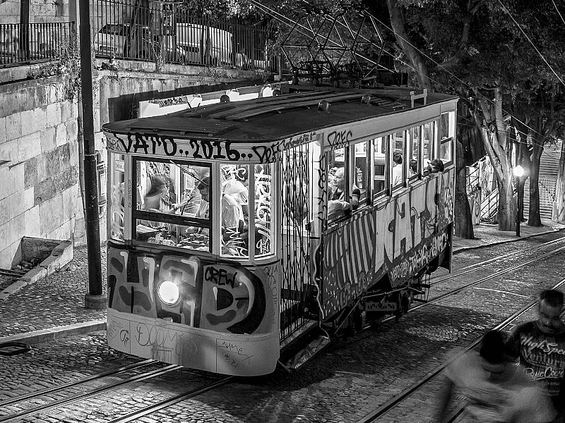 De tram in Lisboa blijft ook 's nachts rijden. De tram is een uitkomst voor vermoeide nachtgangers op de steile (en gladde) wegen van deze wereldstad. De tram zelf ziet er ook wat vermoeid uit maar met af en toe een verse graffiti-tatoo blijft hij op de been..uh..op het spoor.