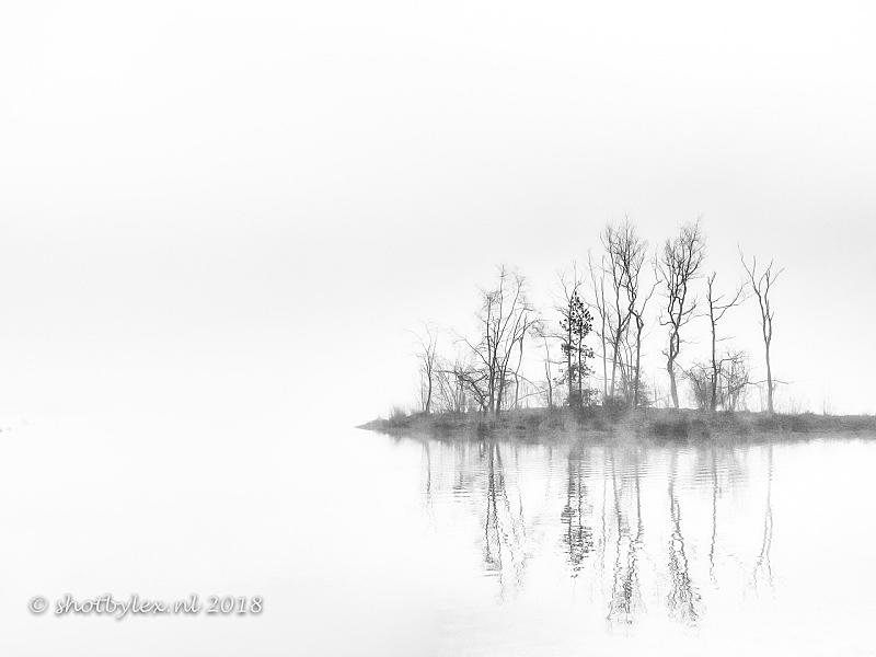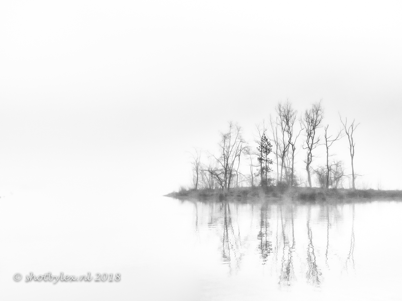 Mist, ik houd ervan. Het doelloos ronddwalen in een kleine werled en niet te ver vooruit kunnen kijken. Deze foto is gemaakt in de Hatertsevennen bij Nijmegen. De mist zorgde voor een egaal en diffuus licht, het water van het ven weerspiegelde de waterkant...