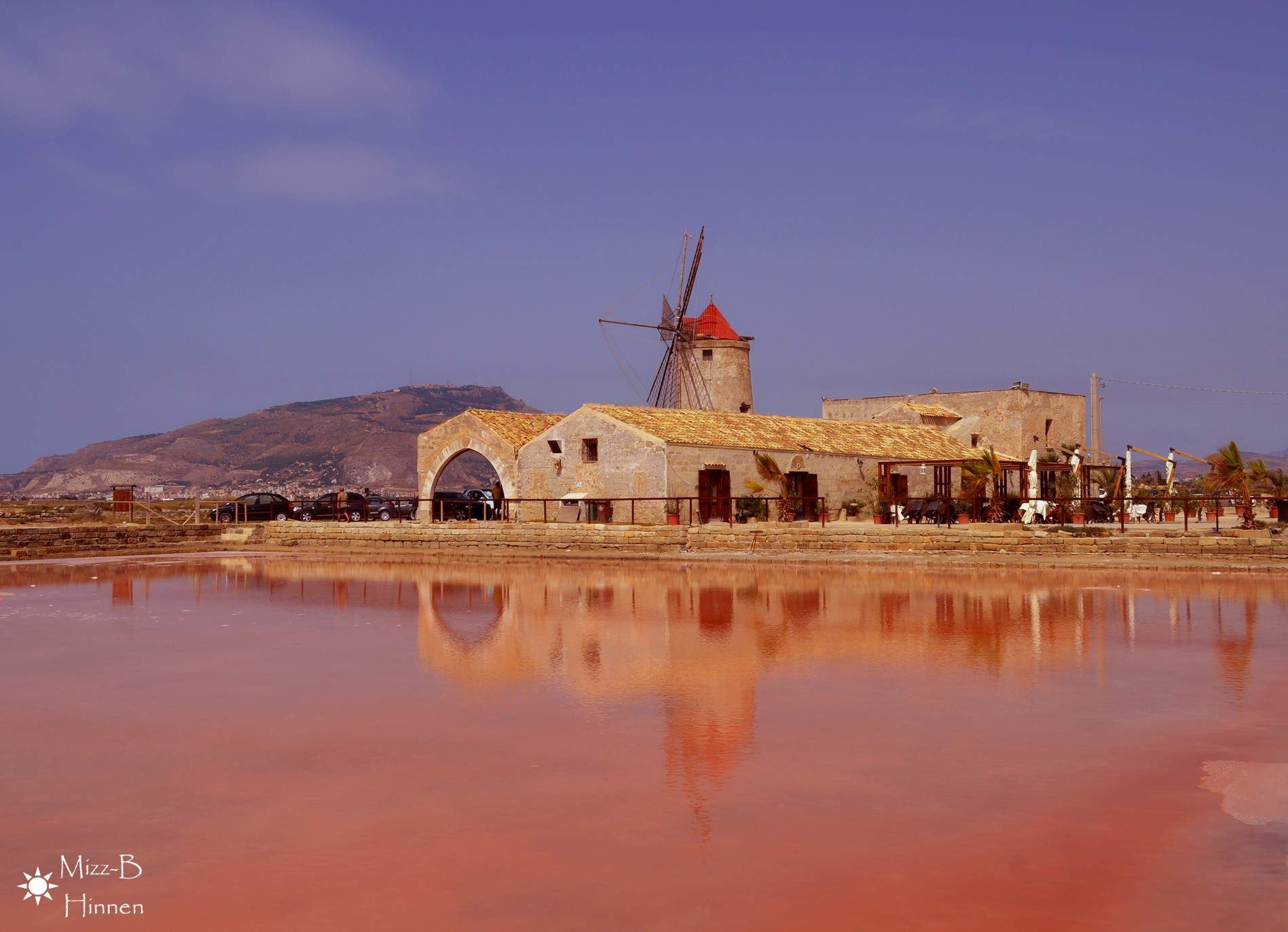 Op de opgeworpen eilandjes staan gerestaureerde windmolens. Ze herinneren aan de tijd dat zij nog het enige instrument waren om het water weg te pompen en het zout te malen.