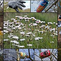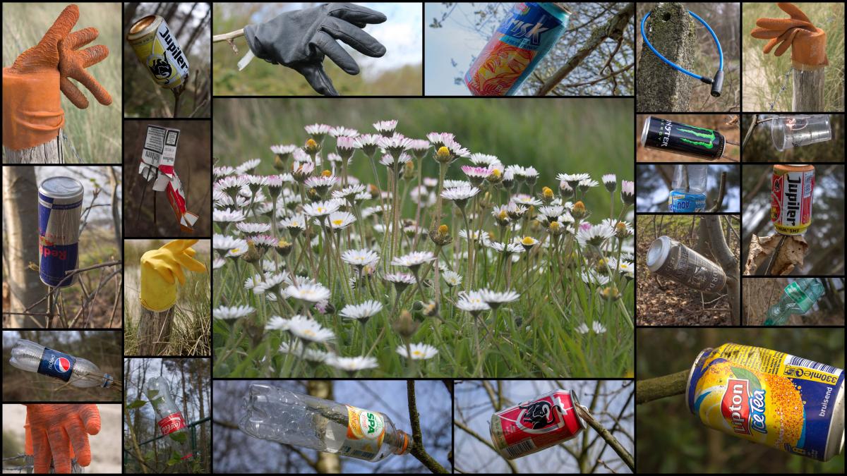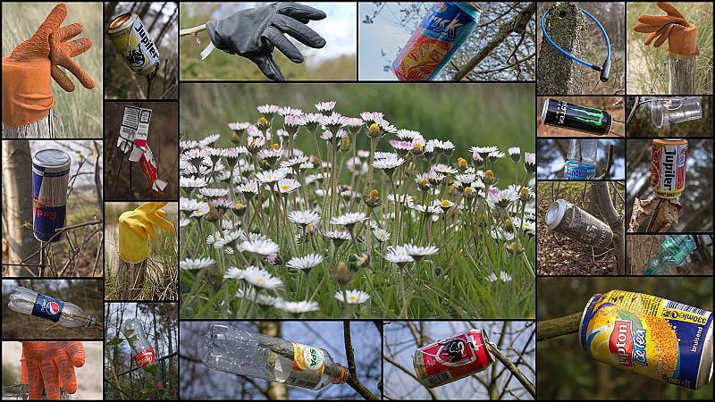 De madeliefjes staan in de lente mooi in bloei, maar ondertussen bloeit er ook meer afval. Dit contrast probeer ik in deze collage weer te geven.