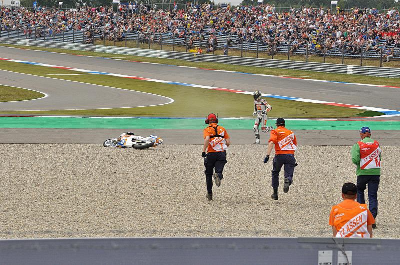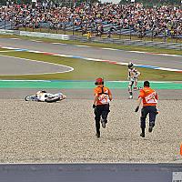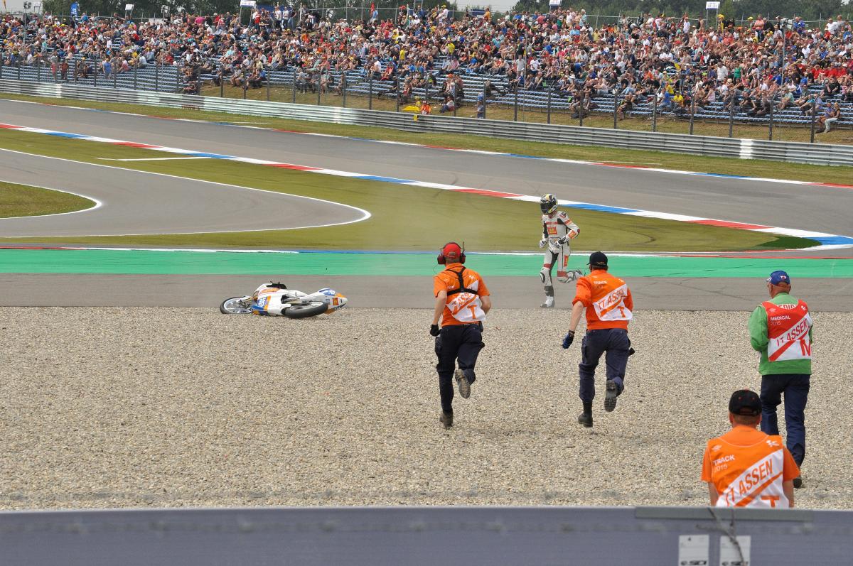 Een kleine crash van een coureur in Assen tijdens de TT 2015.De marshalls waren snel ter plaatse.