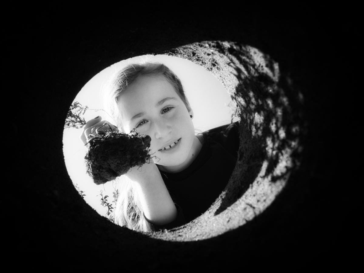 Lekker buiten bezig zijn! Ik wilde een protret maken dat uit de grond leek te komen. Daarom is de bodem uit een bloempot gehaald en de binnekant ingesmeerd met lijm. Daarna heb ik de binnenkanten bekleed met grond. Zo heb ik een koker en lijkt het net of mijn dochter iets uit de grond haalt...