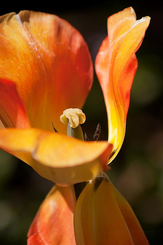 Mei begint met een heerlijke stralende zonnige dag en dat betekent genieten van buiten zijn met de camera mee. Ik hou van tulpen en vandaag heb ik gekozen voor deze kleurige tulp die bijna haar bloemblaadjes aan het verliezen is.