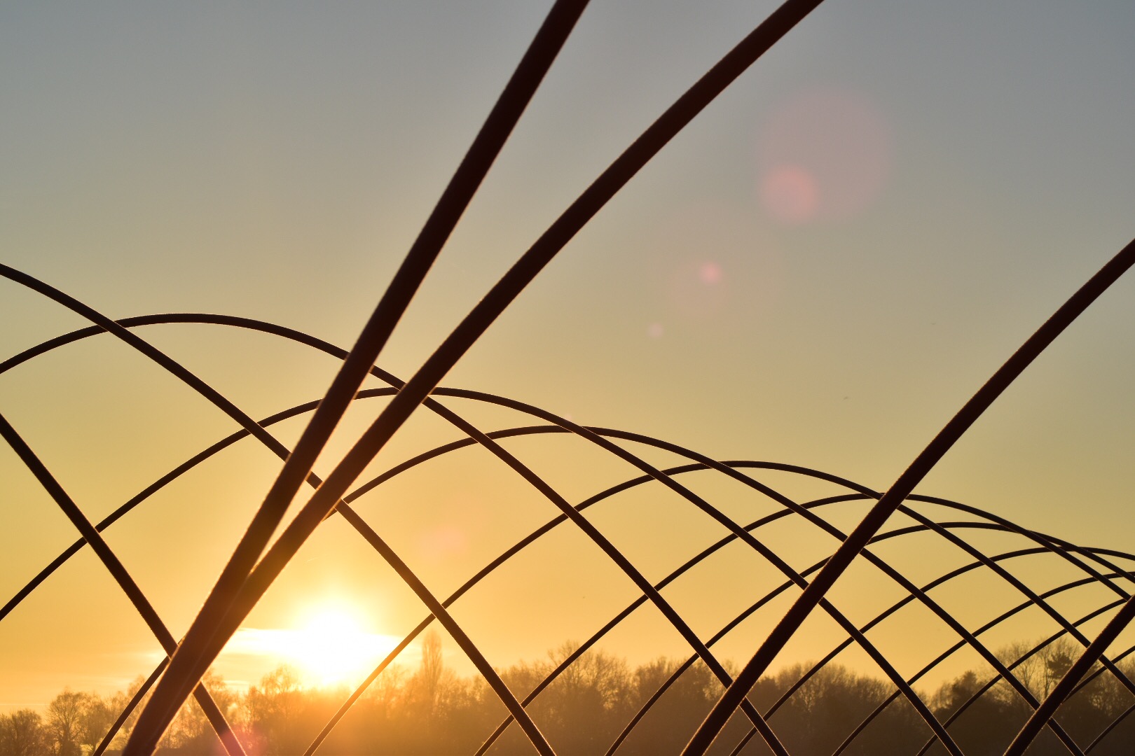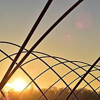 Deze kassen zijn ontdaan van het plastic waaronder gewassen in het warmere seizoen goed tot groei komen. De zon kwam op deze ochtend net op. De rijp nog een klein beetje zichtbaar door de glinstering van het weerkaatsen van het licht.