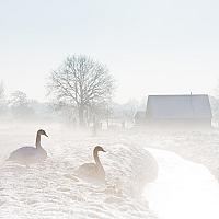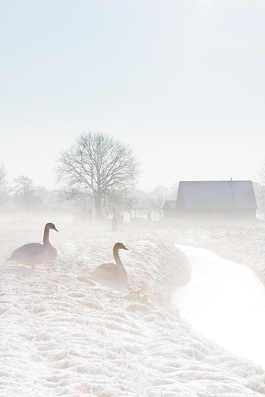 Twee zwanen in de sneeuw tijdens zonsopgang