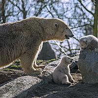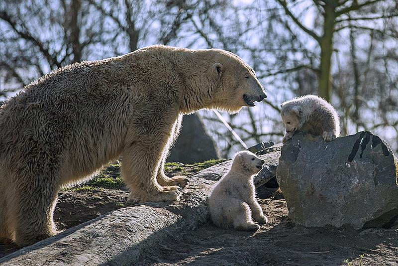 De ijsberentweeling met moeder Olinka in het buitenverblijf in Diergaarde Bijdorp te Rotterdam. Weliswaar tegenlicht en door ruit van toeschouwersruimte. Een flitsje had wonderen kunnen verrichten, maar A: die komt dan misschien wel ver genoeg voor de invul, maar B zou door ruit weerkaatst worden.