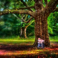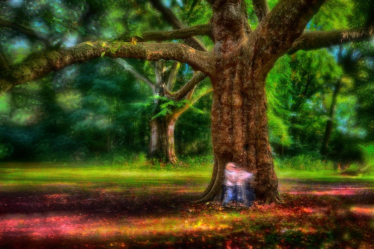 Een iets te lange sluitertijd en mijn kleinzoon die rond de boom danst. In lightroom de raw foto iets versterkt.