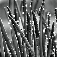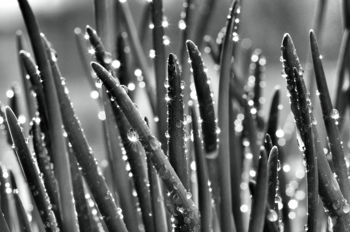 schittering van de zon in de druppels op de stengels van een bieslookplant.