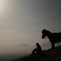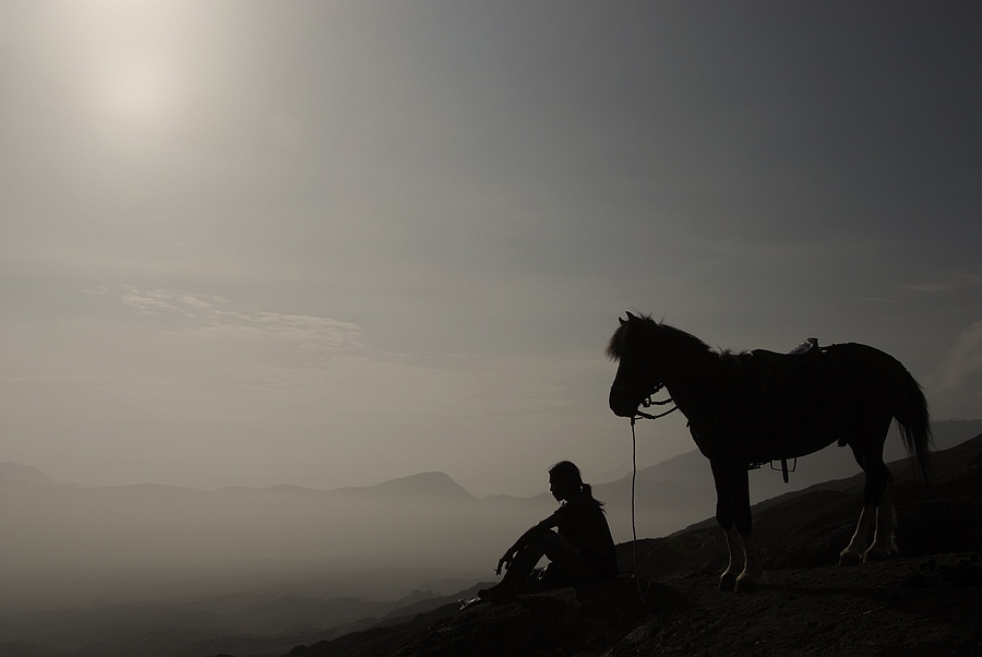 man en paard aan de voet van de Bromo vulkaan op Java.