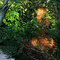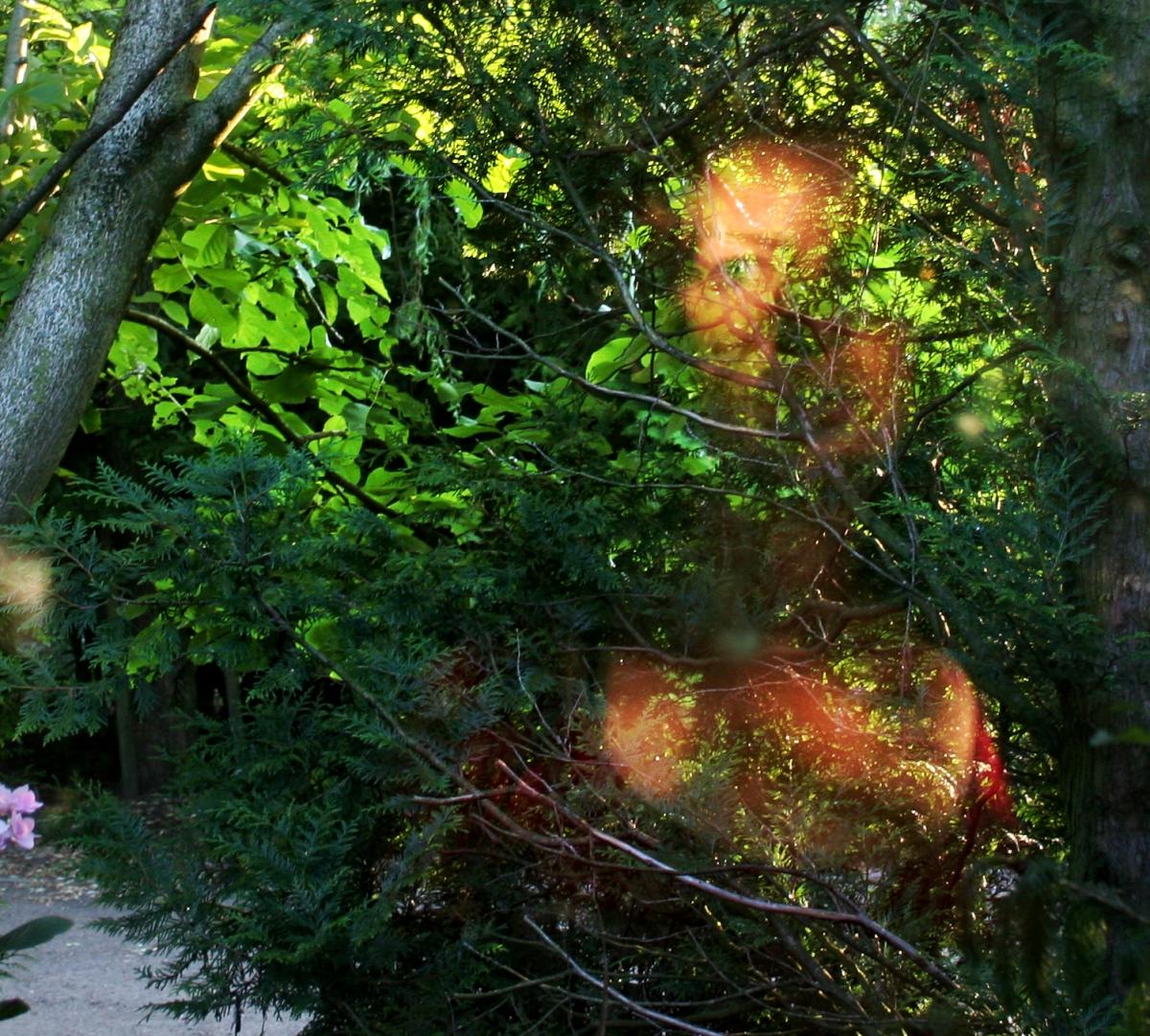 Het effect als ik tijdens het gouden uur door mijn keukenraam naar buiten kijk, waarbij een spiegeling in het raam ontstaat.