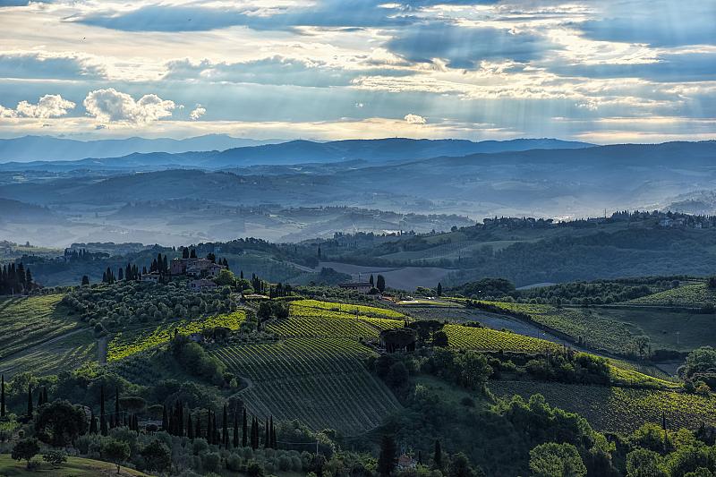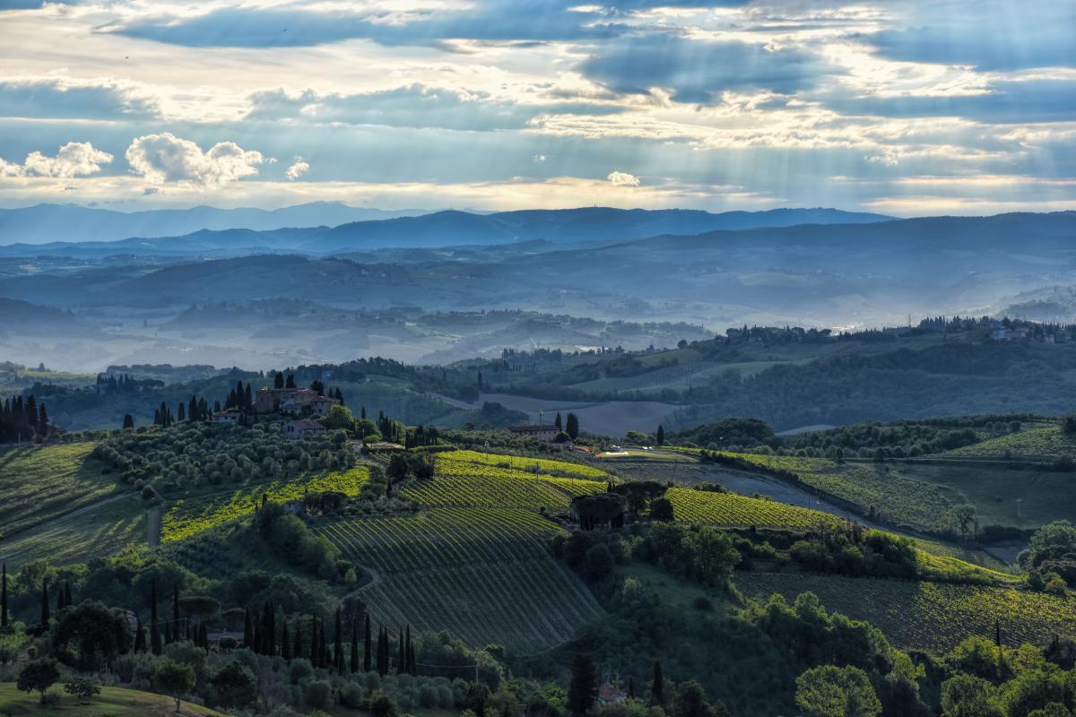 Het uitzicht vanaf de muren van San Gimignano over het Toscaanse landschap in de vroege ochtend.