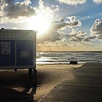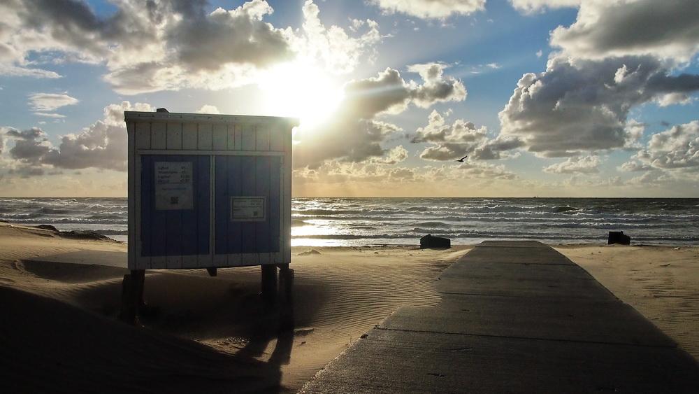 2 weken vakantie op Texel resulteerde in deze foto, gemaakt op de laatste dag. De zon ging onder, bijna niemand op het strand, het lage licht over het zand en dan dit huisje waar je in warmere tijden strandstoelen kunt huren.