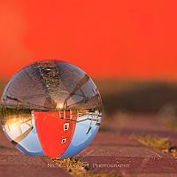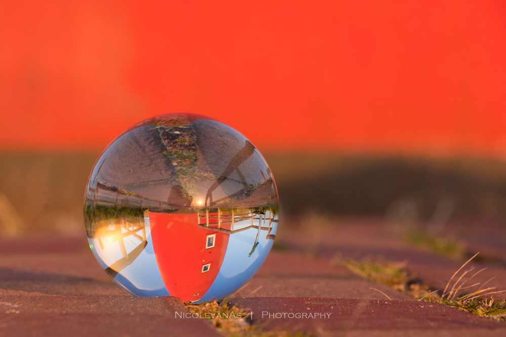 De vuurtoren van Texel in de glazen bal. De vuurtoren kreeg ik niet volledig in de bal, dit komt door de ronding. Geeft wel een enorm leuk effect.