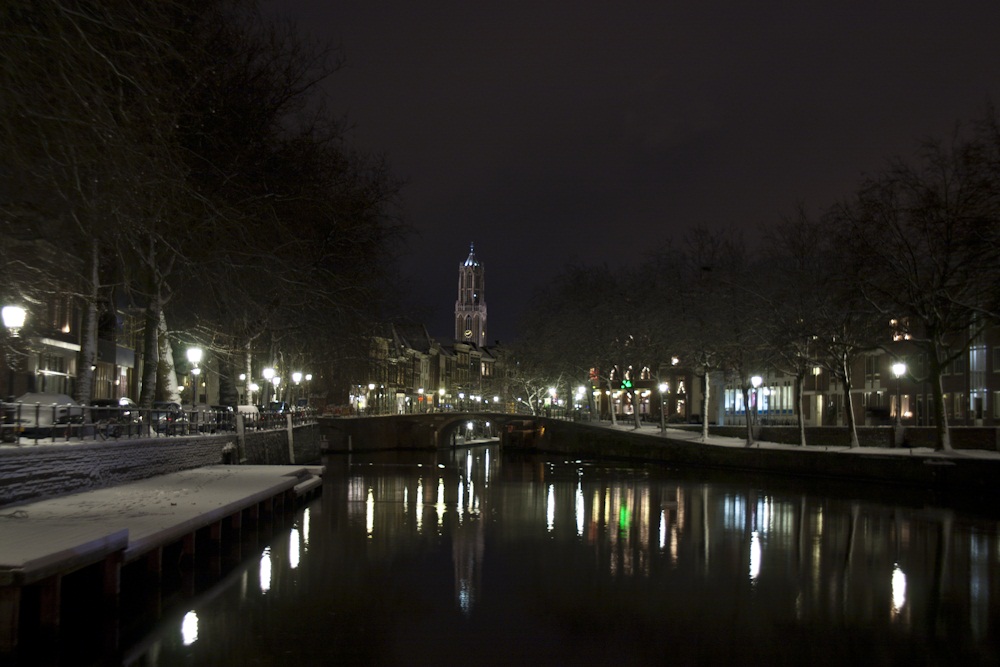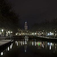 Het stedelijk landschap van Utrecht in de sneeuw.