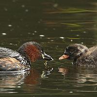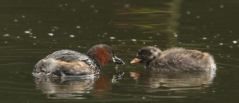Vader dodaars biedt zijn jong een stekelbaarsje aan.