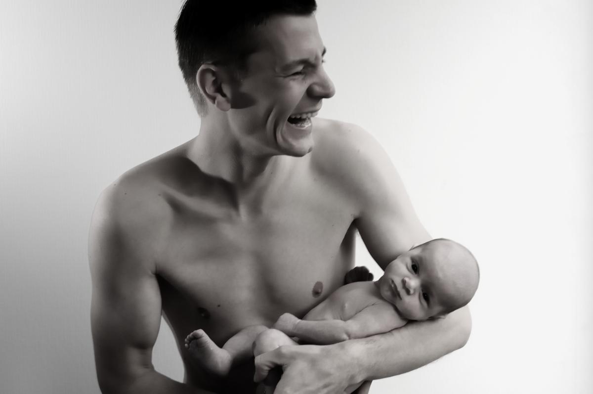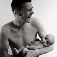 Vader schiet in de lach, omdat de baby even..eehh...ontspant. De blik van de baby zegt genoeg...
