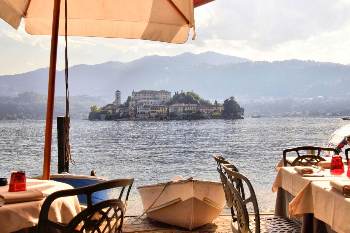 Op een heerlijk terras aan het meer met uitzicht op het Isola San Giullio, de boot ligt al klaar om er naar toe te varen.