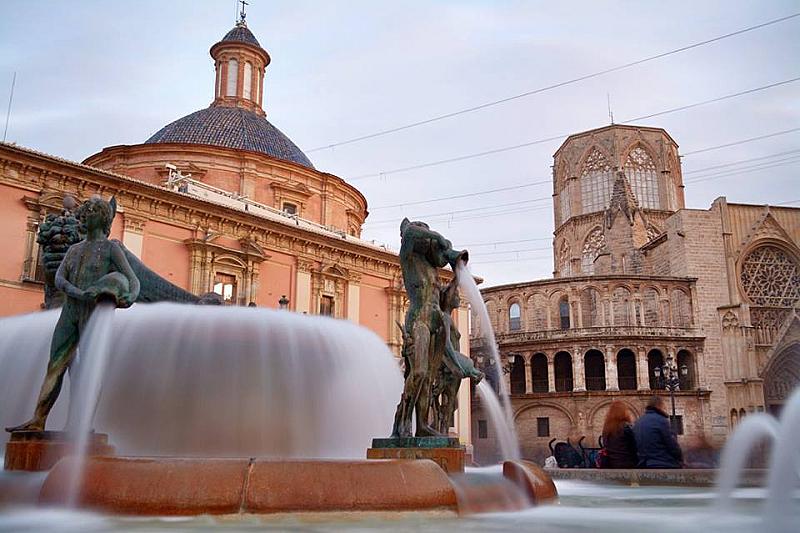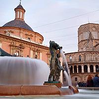 Lange sluitertijd bij de fontein op het Plaza de la Virgen in Valencia.