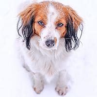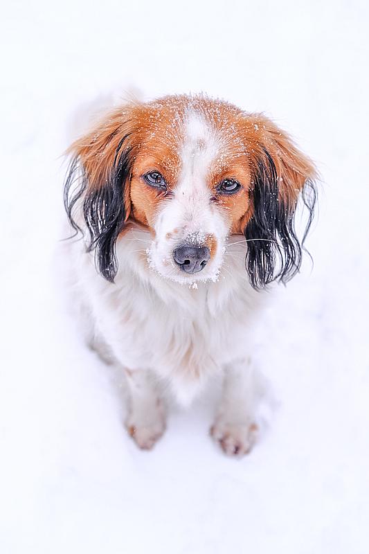 Kooikerhondje in de sneeuw met vogelperspectief