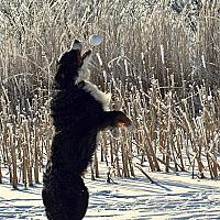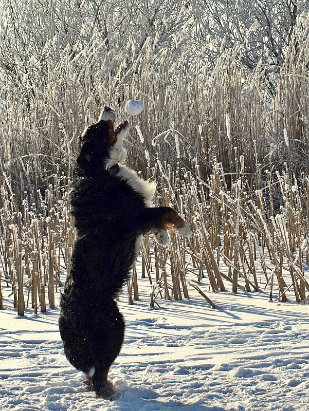 Een onbekende hond op het ijs bij Kinderdijk die een sneeuwbal vangt.