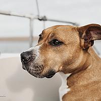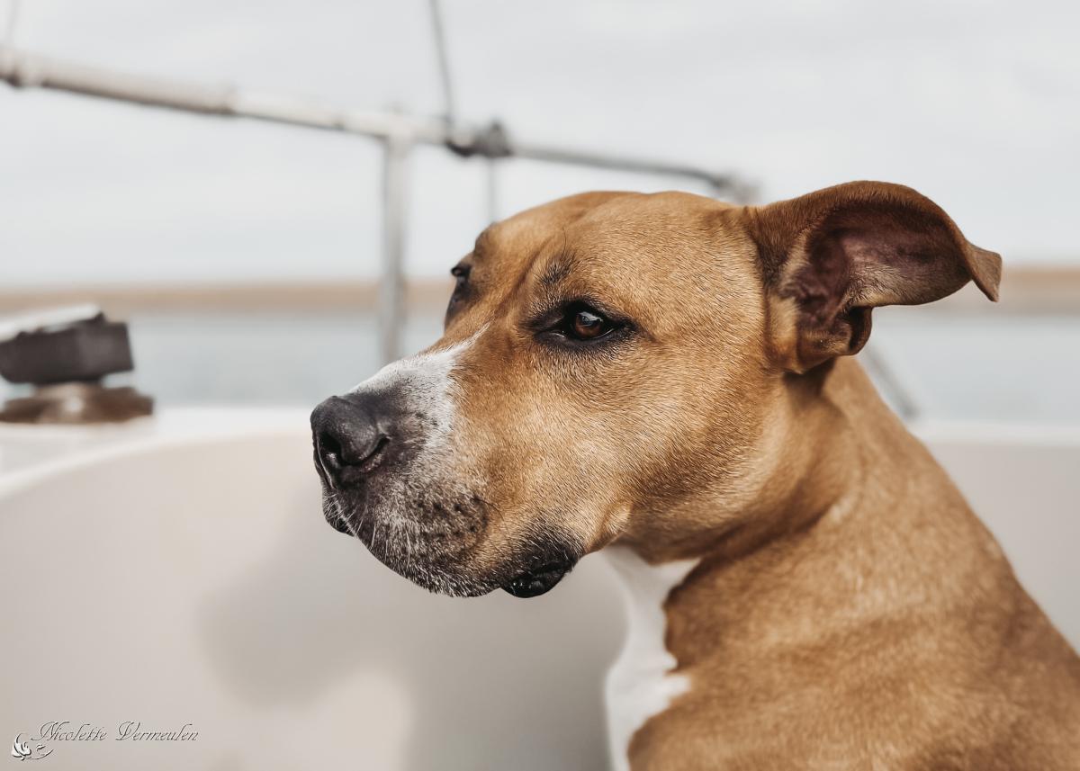 Amerikaanse stafford geniet van een vaartocht op de Oosterschelde.