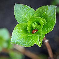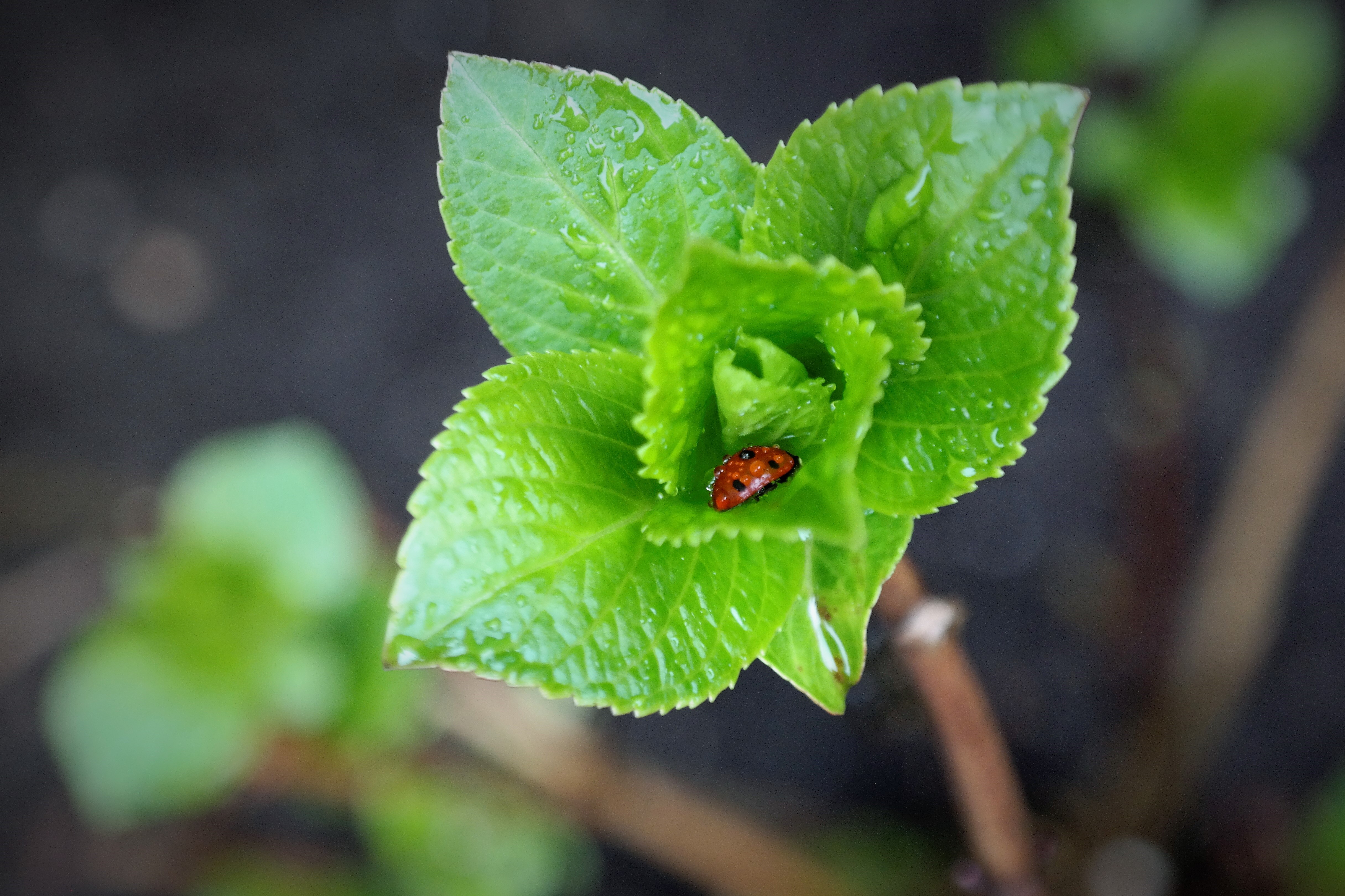 De regendruppels, het daglicht (diffuus) en de frisse groene kleur van de jonge blaadjes van de Hortensia werkten goed samen.