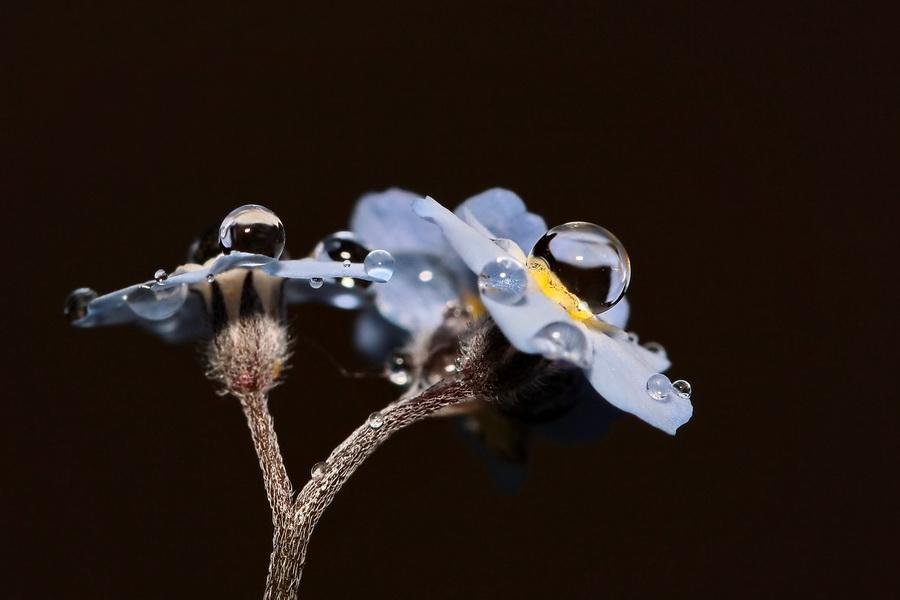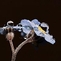 Ik heb iets met waterdruppels. Toen het een keer geregend had, zaten er druppeltjes op het vergeet-mij-nietje. Met de camera en macrolens natuurlijk wat foto's maken en wat blijkt, de druppels zijn rond op het bloemetje.