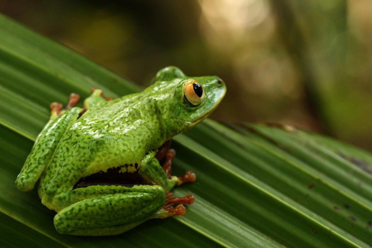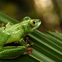 Deze Sechellaanse 'leaf frog' staat klaar om te springen naar het volgende palmblad, hopende daar een gewillige kikker van het andere geslacht te vinden.