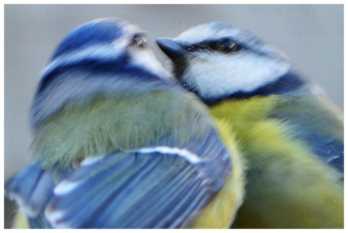 dit koolmeesje heeft de lente kriebels, hij is smoor verliefd op z'n spiegelbeeld