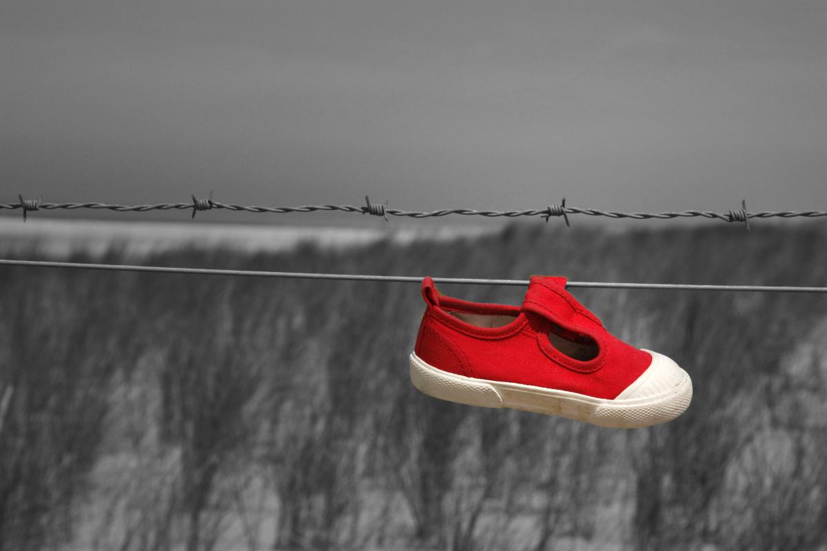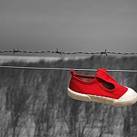 Dit rode schoentje hing aan een draad in de duinen. Waarschijnlijk verloren en door iemand hier opgehangen.
