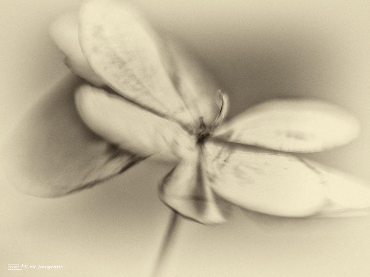 Een gedroogd bloempje van de hortensia, gemaakt met dubbele belichting, en omgezet naar een vintage stijl.