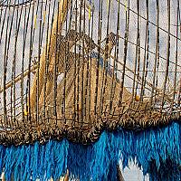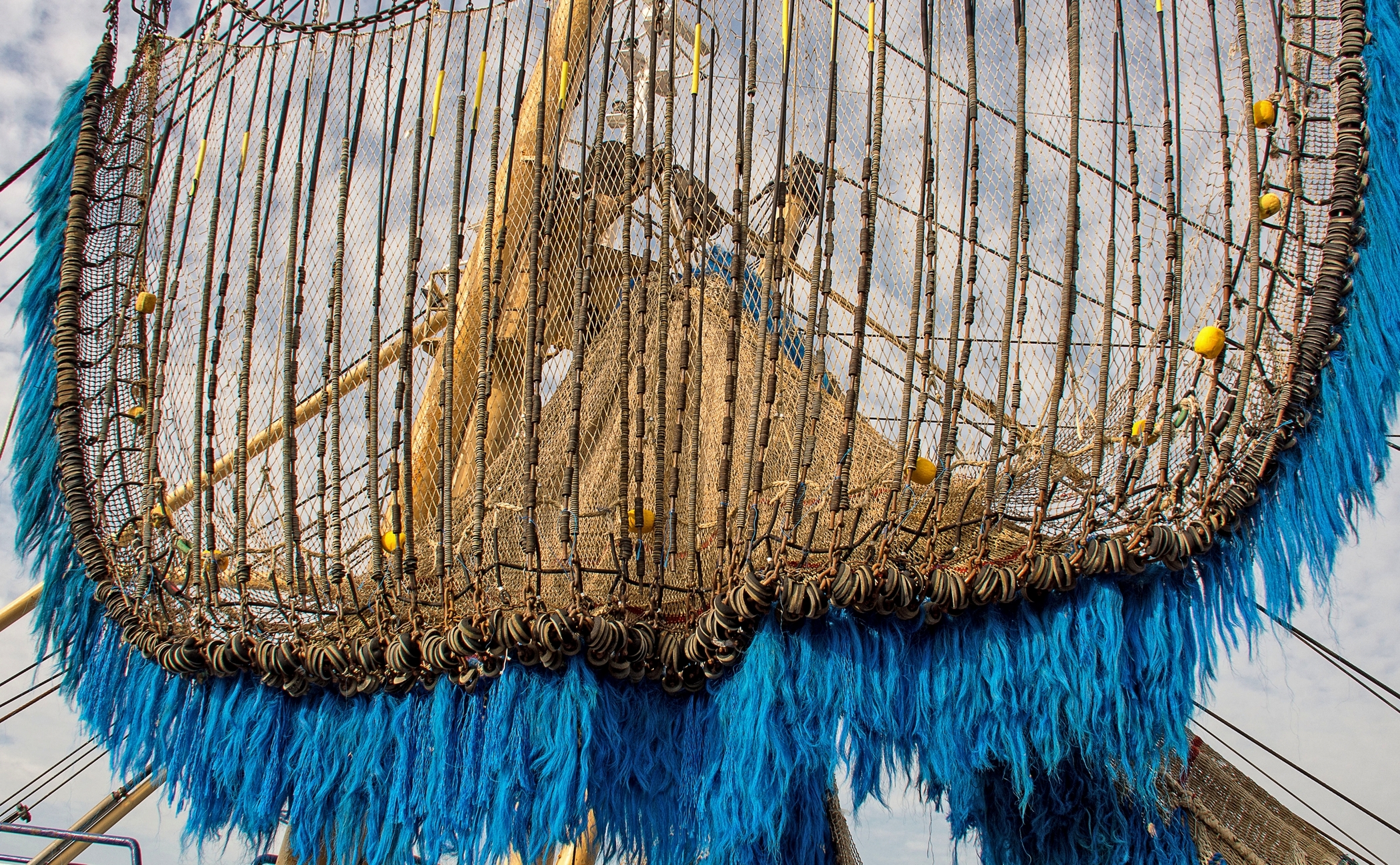 Visnetten hangen te drogen op de boot