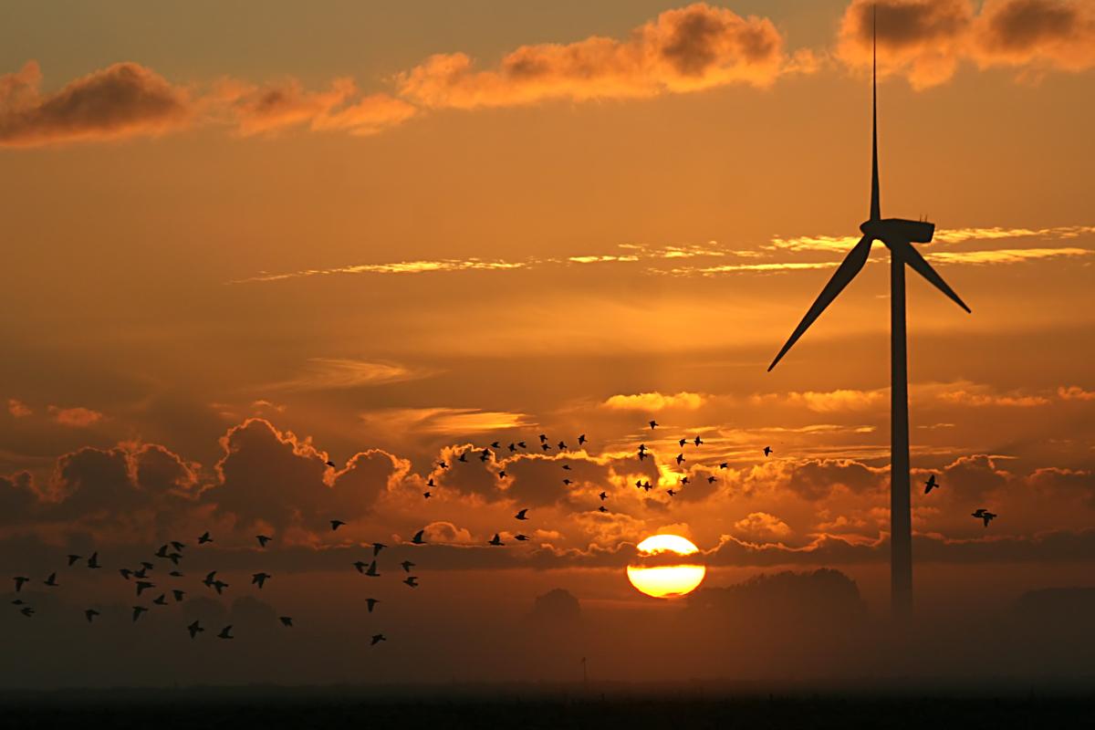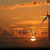 windmolen,vogels en de ondergaande zon,