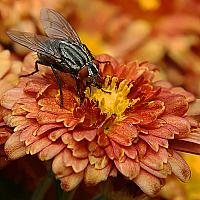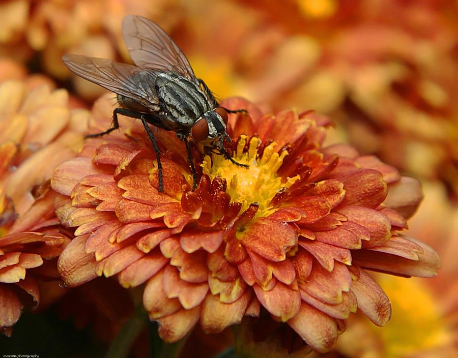 Ik had geluk dat deze dambordvlieg op onze oranje Chrysant ging zitten vanwege de combi met zijn ogen (-: