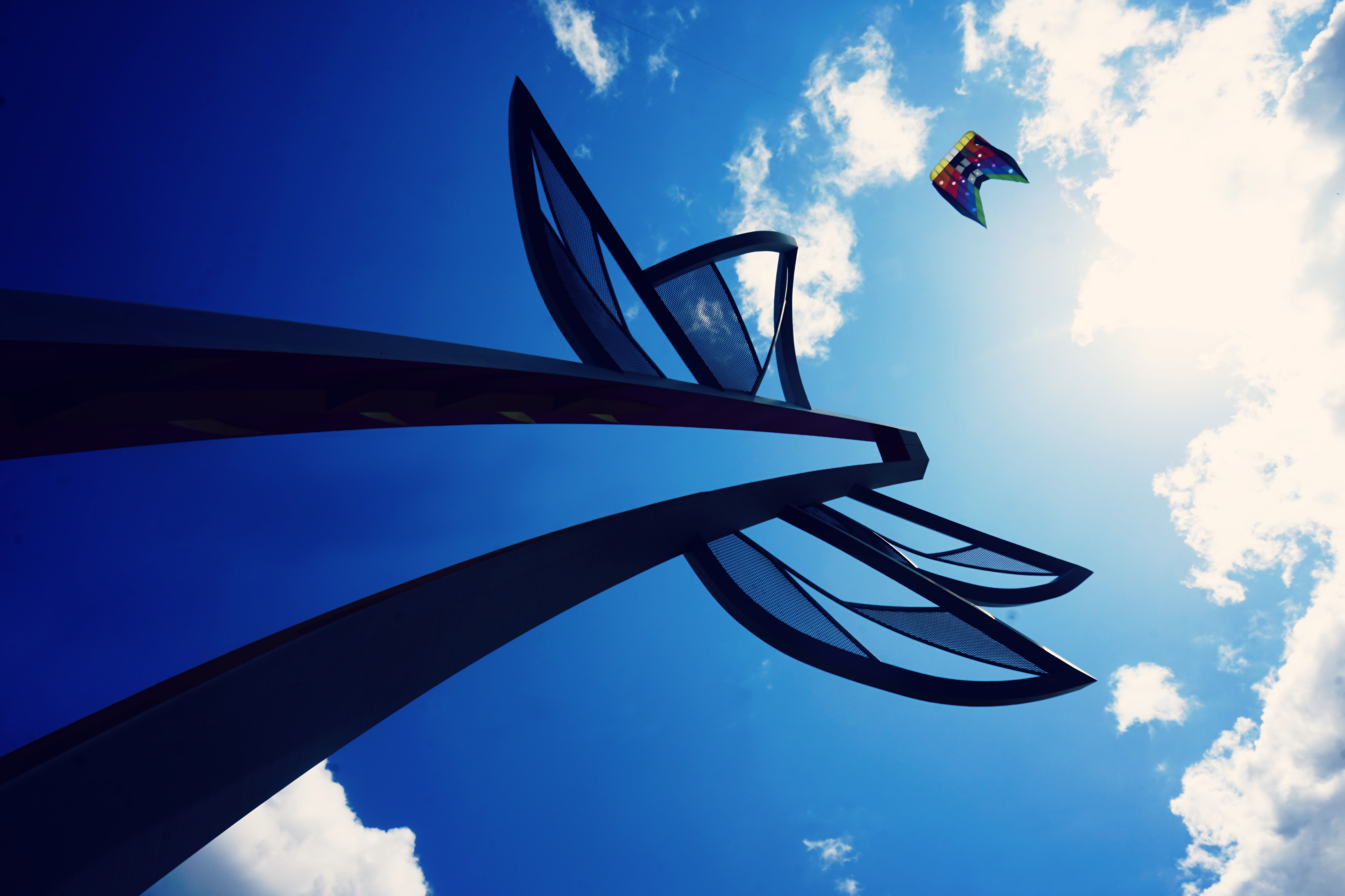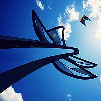 Op het Vliegerfestival in Spijkenisse maakte ik dit kunstzinnige shot. Mooi standpunt vanonder dit mooie kunstwerk aan de Maasbouleverad. Rechtsbovenin de kleine (maar toch hele grote) vlieger in eenzelfde vorm. Het kunstwerk kleurt prachtig tegen de Hollandse wolkenlucht.