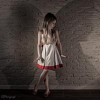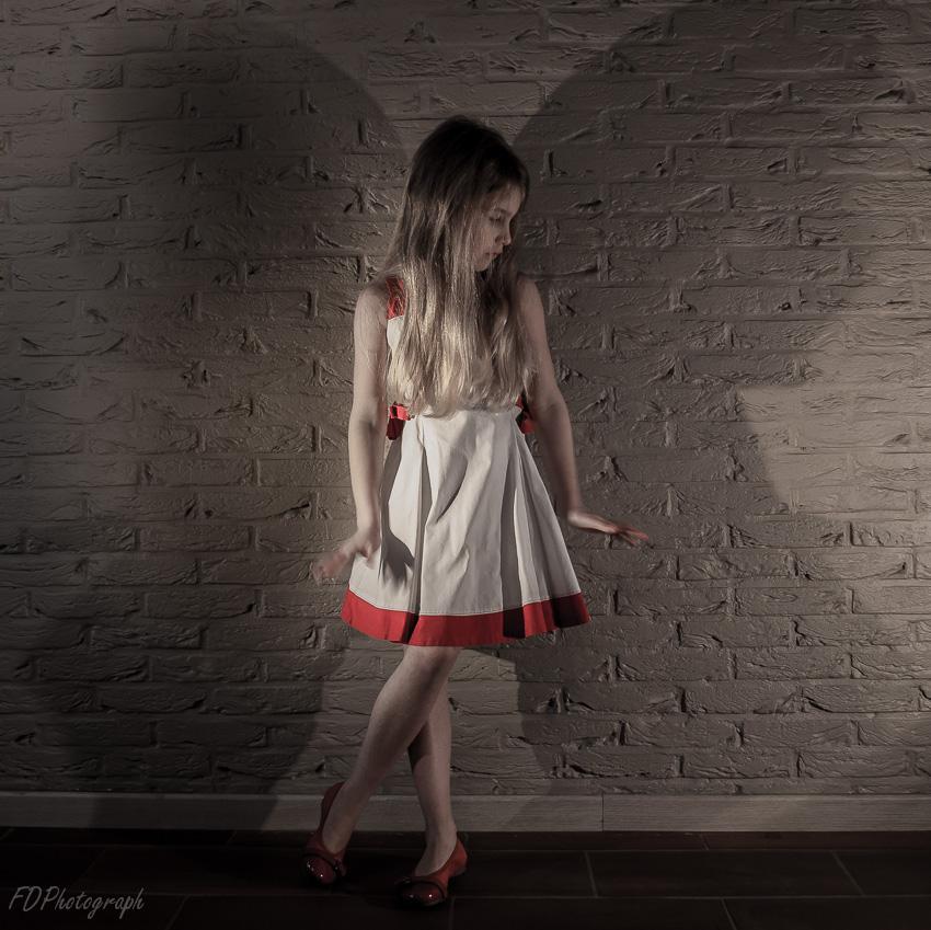 Deze foto van mijn dochter heb ik genomen in mijn living met behulp van 2 lampen. De verkregen schaduwen zijn zoals vlinderblaadjes. Deze foto werd bijna niet bewerkt.