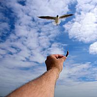 Dwergmeeuw twijfelt of hij het stukje vlees durft te pakken