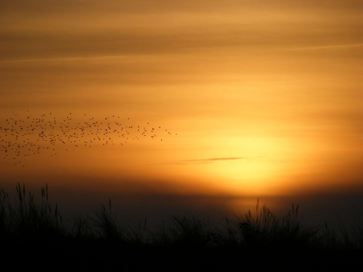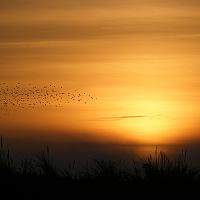 Vlak naast de veerpont van Texel wadlopen en in de verte een zwerm vogels zien opvliegen tegen een ondergaand avondzonnetje. Geweldig om de lens op een flinke tele-stand de uit beeld verdwijnende zwerm vogels scherp te krijgen en de omgeving met een zacht randje. Op de voorgrond de dijk als afscheiding met de Noordzee. Een schilderijtje.