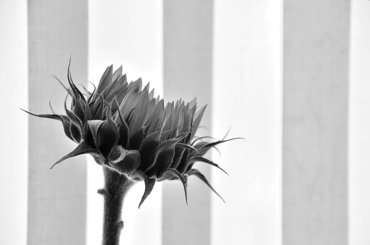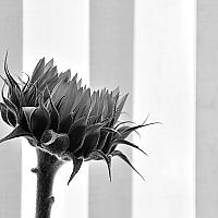 Na het dichtdoen van de lamellen tegen de zon, kwam de zonnebloem zo mooi uit tegen het gordijn.