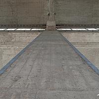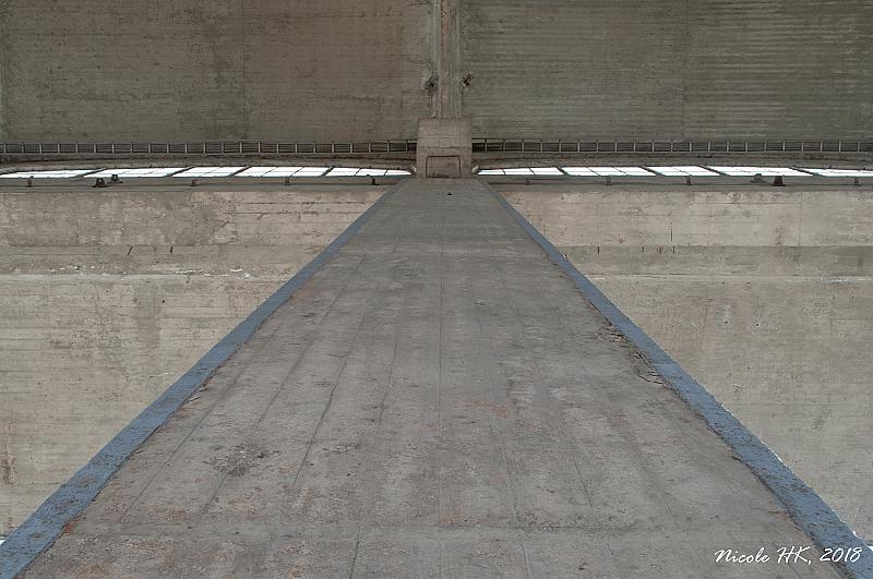 Een kijkje omhoog langs een pijler van de toegangspoort bij de ENCI in Maastricht.