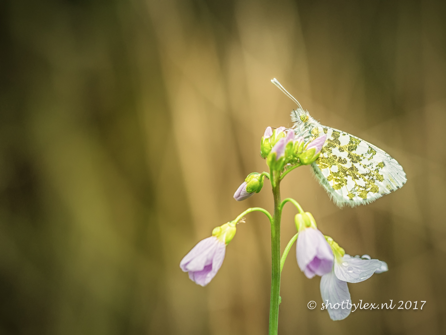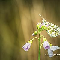 In het voorjaar als de pinksterbloemen bloeien zijn ook altijd e oranjetipjes weer te vinden. Dit vlindertje hing nog te drogen op een winderige ochtend, na een koude en natte nacht. Het riet zorgde voor de zachte bruine achtergrond.