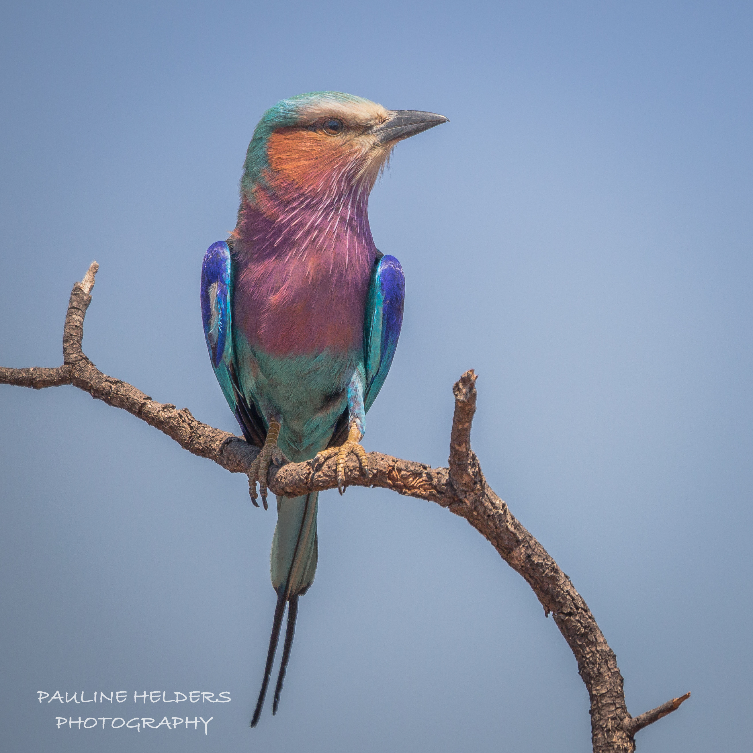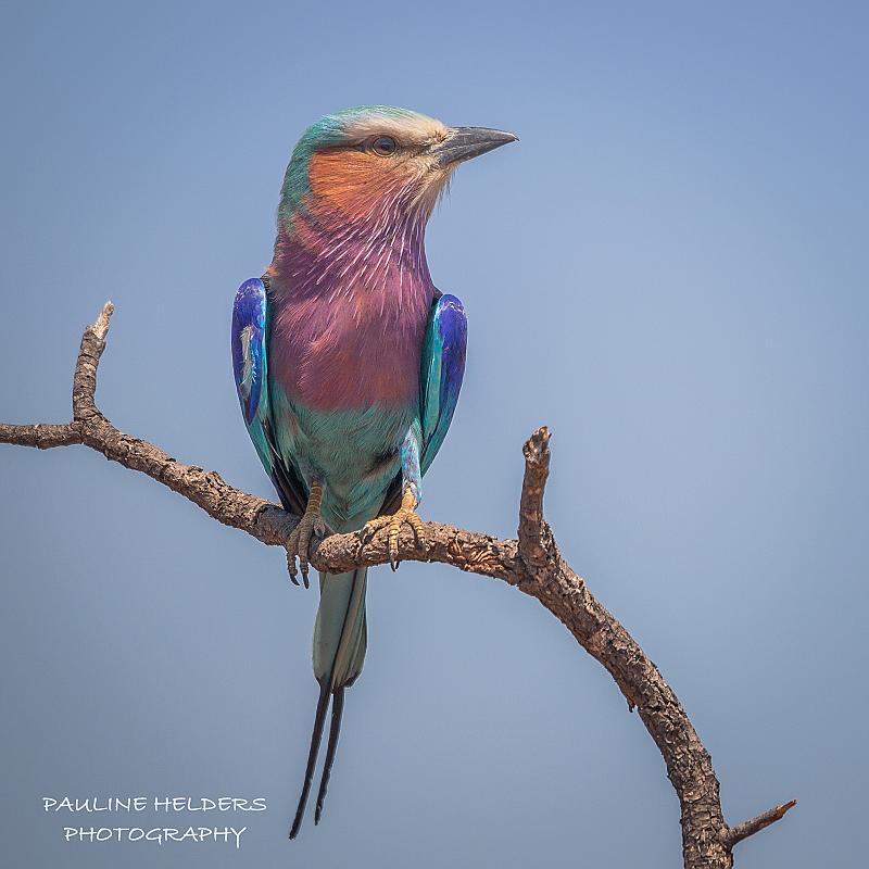 Prachtige kleuren bij de lilac-breasted roller in het Kruger Park, Zuid Afrika