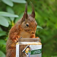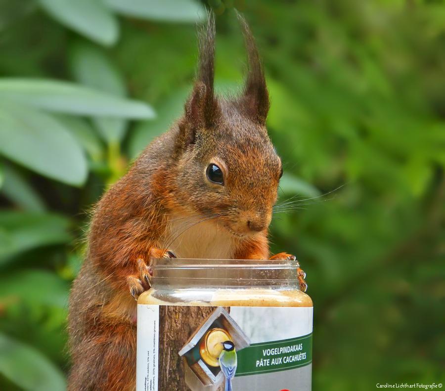 Dit Eekhoorntje vond onze vogelpindakaas. :-)