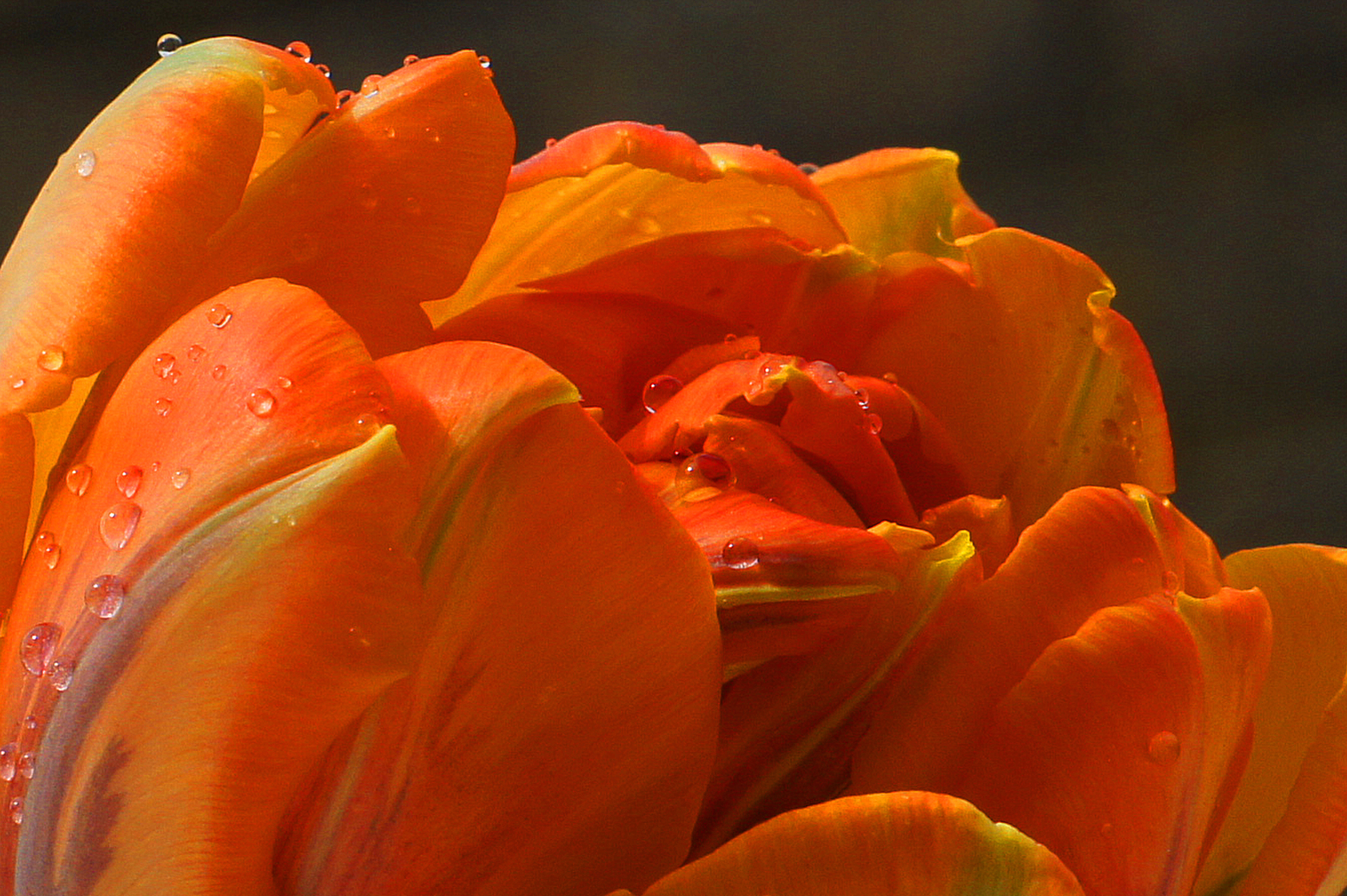 Op deze prachtige Oranje Tulp zaten druppels, ik zag ze opeens als tranen, van vreugde omdat Oranje doorgaat of van verdriet omdat...nee daar gaan we niet vanuit!